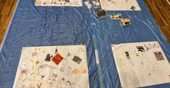 よ~~く眺めていると、むしろ、保護者のほうが没頭している光景もしばしば。。。(自分も描いたり塗ったり、見守りを忘れてしばしば。。。)そして今年は、新たなイベント“おおまくんと「体をつかっていっしょにあそぼう!」”が11時から始まりました。色おに、ジェスチャーゲームなどで会場中を動きながら大盛り上がり! DOOR事務局の方も自然と誘われて、自然と溶け込んで遊んでいました 笑。そのような中でも、模造紙と向き合ってアートする保護者と子どもたちもいて、「動」と「静」が同居する不思議な空間ができあがりました。