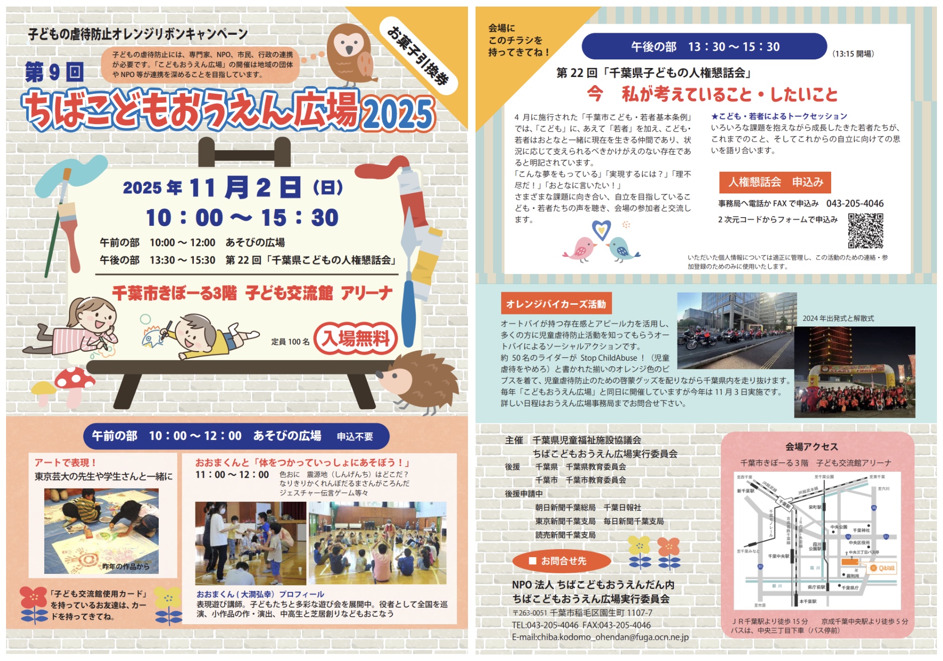 11月の文化の日前後に千葉市内で開催される、子どもたちのあそび場やトークセッションを通じて子どもの人権を考えるイベントで、今年で9回目となりました。主催は千葉県児童福祉施設協議会、ちばこどもおうえん広場実行委員会(ちばこどもおうえんだん内)。午前は、あそび場を設けて、地域の子どもたちがまざりあって遊びます。午後は、数人の子どもや若者たちがトークセッションする「千葉県こどもの人権懇話会」が開催されました(今年で22回目)。子山ホームでDOOR受け入れを担当されてきた池口さんが実行委員をなさっています。