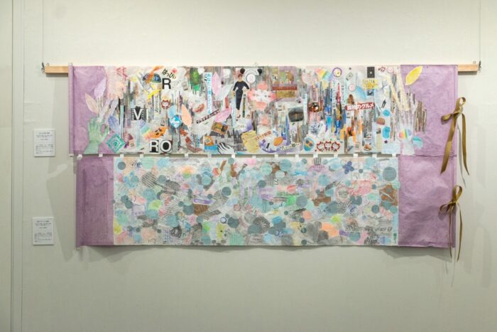 雑誌やパンフレットといった身の回りの素材や、フロッタージュという技法を使って用意した素材を用いて、自由に絵巻を装飾していくという作品です。リスペクさんの事業所内に飾っていただき、利用者さんが好きな時に作品作りができるようにしたり、藝大散策企画などの機会を使ってDOORメンバーとも一緒に制作をしました。また時には、以前からリスペクさんと交流があった地域の銭湯にも展示させていただき、来店した方に自由に書き込みなどができるようにもしたことで、地域とも一緒にコラボした制作をした作品となりました。