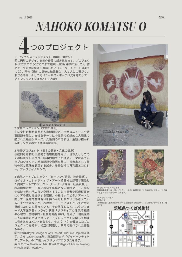 小松は茨城県生まれで茨城県育ちです。日本と英国を拠点にするアーティスト/現代画家です。小松は絵画を通じて、時事問題や女性の権利、平和、SDGs、日本文化といった多様なテーマにに対する自分自身の感情や思想を探究しています。加えて,2023年RCA GD修了。2025年英国Master of Arts Royal College of Art in Painitng, MA 修士取得。RCA在学中よりホスピタルアートを始めました。東京藝大Doorをハイブリッドで修了。8期生。医療とアートの交差するこの取り組みには社会貢献の想いと、アーティストとしての責務を込めています。日本国内にて初めての個展、さまざまな作品をお楽しみください。