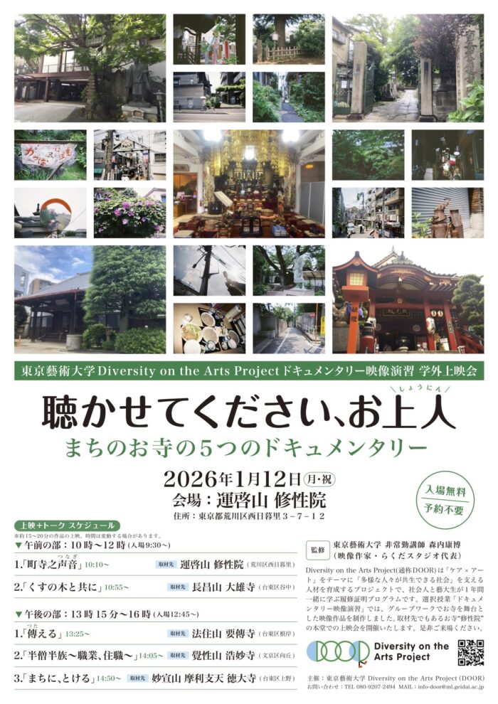 Diversity on the Arts Project(通称DOOR)は「ケア×アート」をテーマに「多様な人々が共生できる社会」を支える人材を育成するプロジェクトで、社会人と藝大生が1年間一緒に学ぶ履修証明プログラムです。今年度の選択授業「ドキュメンタリー映像演習」では、グループワークでお寺を舞台とした映像作品を制作しました。取材先でもあるお寺“修性院”の本堂での上映会を開催いたします。是非ご来場ください。