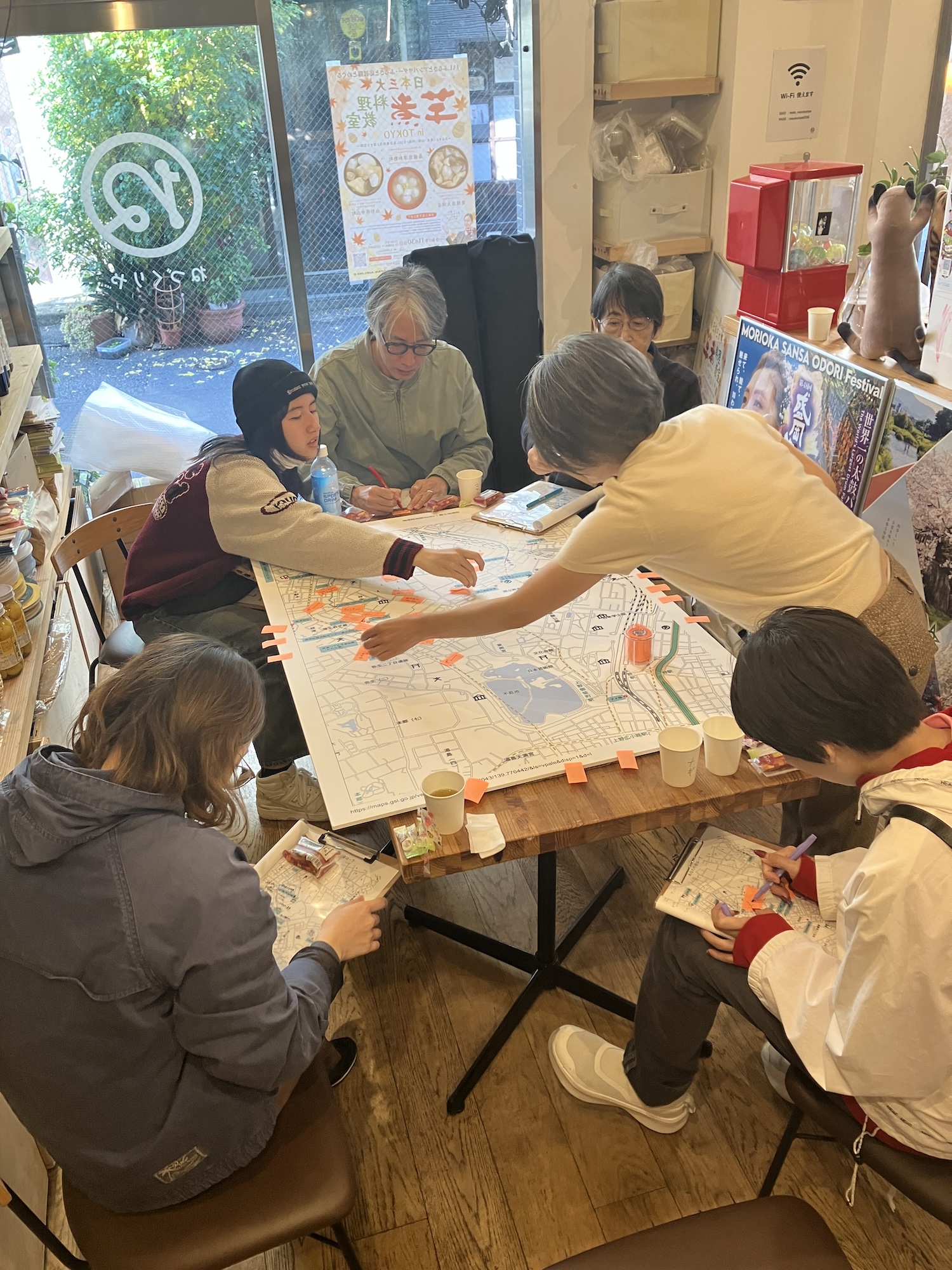 概要: サウンドウォークのワークショップを実施し、参加者それぞれが感じたこと、聞いた音、オノマトペを付箋に書いてA0サイズの地図パネルに反映した。サウンドウォーク後に、参加者が口頭でグループに共有し、共同作業として地図への反映を行った。作成後の地図パネルは、ワークショップを開催した「まちの学び舎ねづくりや」に16日間設置し、来店者が地域のオノマトペを記載できるようにした。今後は調剤薬局など待ち時間に見て参加できる場所にサウンドマップ・パネルを設置し、地域の中で出会っていない人が、見えないけれど確かにいる人の存在に気づく手段のひとつとして提供予定。 活用ツール: サウンドウォークには「重ねる、地図」を使用し、以下のページを追加。