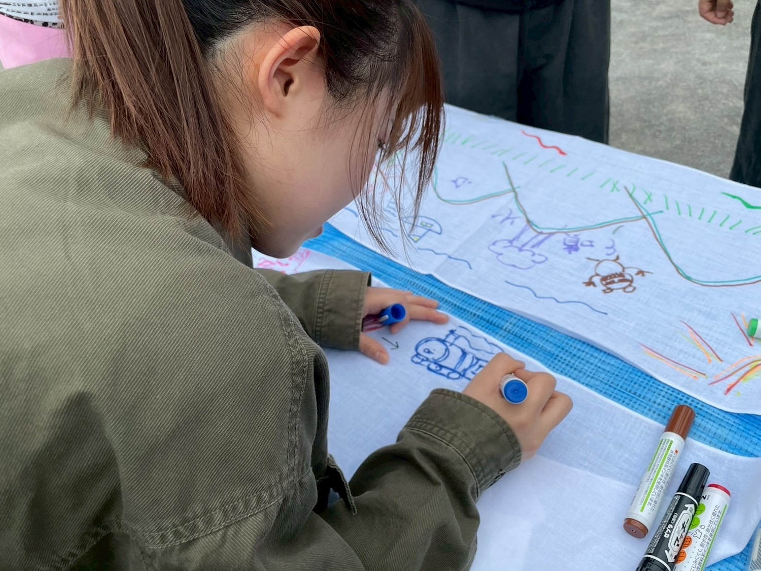 あじいると連携し、「あじいる」と「WhiT-s」のロゴ入りの手ぬぐいにカラーペンで一人ひとりの思いや感覚を自由に描いてもらいました。支援する側・支援される側という立場をこえて、「なかま」みんなが参加できるアートの時間になりました。 手ぬぐいはつくったら終わりの消耗品ではなく、つくったあと暮らしの中で繰り返し使える日用品です。つくること自体が楽しみとなり、完成後も自然と手に取ることができます。使うたびに、その場で過ごした時間や出会いを思い出し、ゆるやかなつながりを感じてもらえたら、という思いを込めました。制作の時間には、絵を描きながら自然と会話が生まれ、日ごろ感じていることを言葉にしたり、互いの存在を知るきっかけが生まれました。アートをコミュニケーションのツールとして用いることで、「なかま」づくりへの一助になる可能性を感じました。