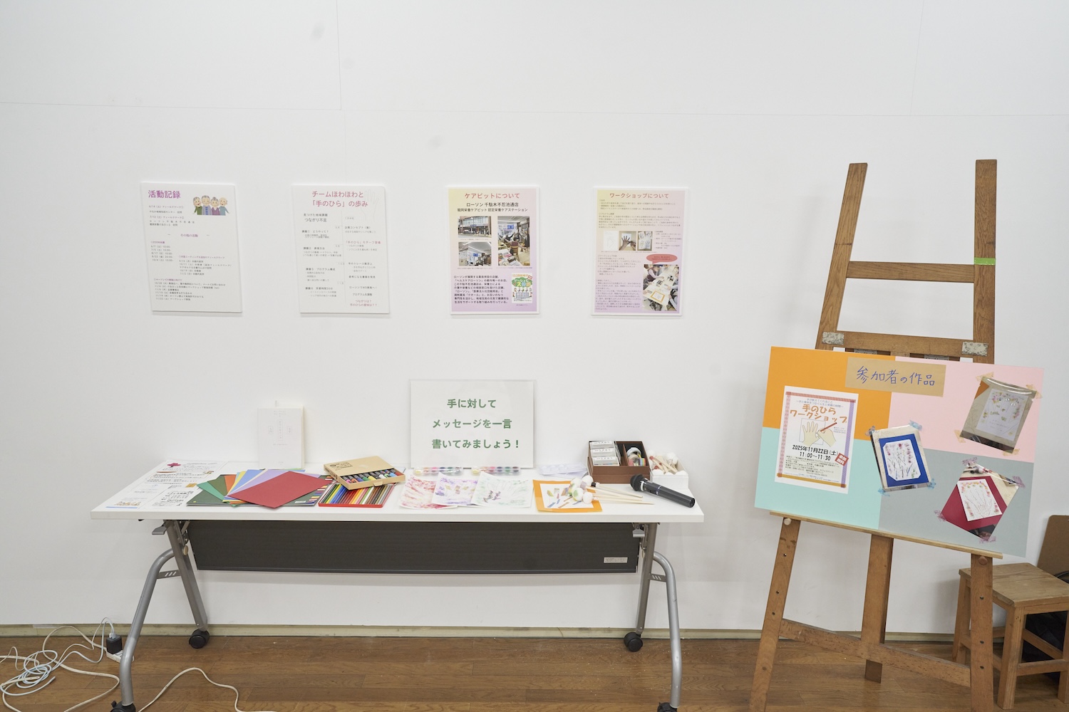 最終的には、企画案を考える段階で挙がっていた、“手のひら”というモチーフをベースに、(医社)龍岡会 ごはんと介護の相談所 龍岡栄養けあぴっと(ローソン千駄木不忍通店 内)が実施している、シニア向けイス体操と関連付けて、手のひらアートのワークショップの実施に至りました。