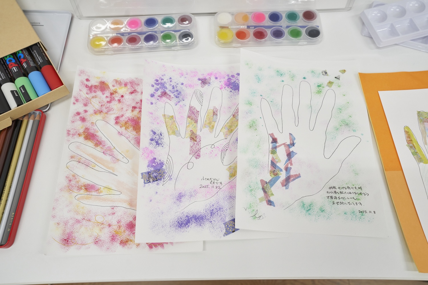 フィールドワークの段階からお世話になっていた、龍岡栄養けあぴっと様のご協力いただき、コンビニエンスストア のイートインスペースで、ワークショップを実施しました。こちらでは、シニアのフレイル予防のため、ほぼ毎日イス体操を実施されています。その参加者を主な対象として、体操後の30分間で、ご自身の手のひらをトレースした後、彩色、最後に手に一言メッセージを添えるという内容で行いました。彩色には、水彩絵の具、ポスターカラー、マスキングテープ、色鉛筆などを用意しました。お好きな色の台紙に挟んでお持ち帰りいただきました。 ご参加くださった方々は、画材に久しぶりに触れる方が多く、新鮮なご様子でした。色々お話をしながら、また職員の方々にもサポートしていただき、和やかなひと時となりました。お帰りの際に、亡くなった旦那様が、絵が好きだったことを思い出したのよ、とお話された方もいらしたそうで、ご自身を振り返る小さな温かい時間になったのであれば幸いです。
