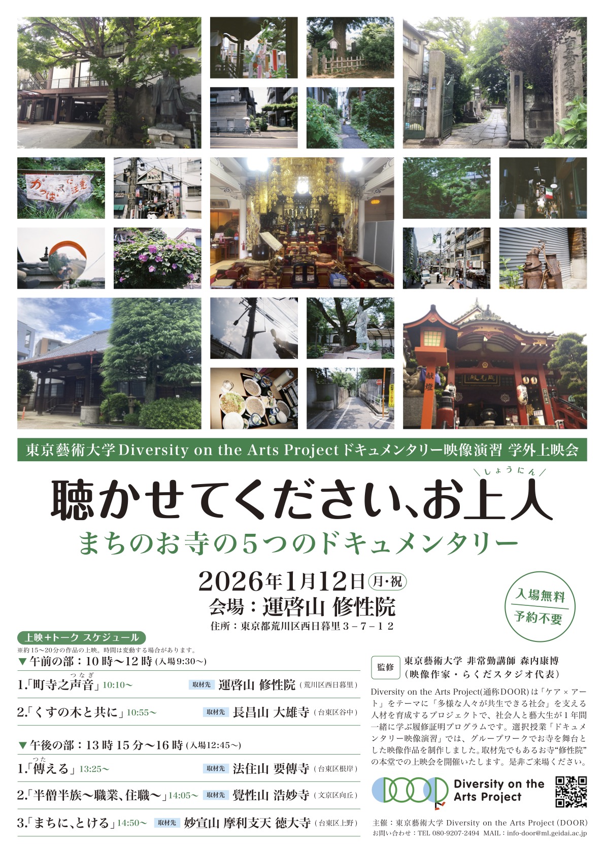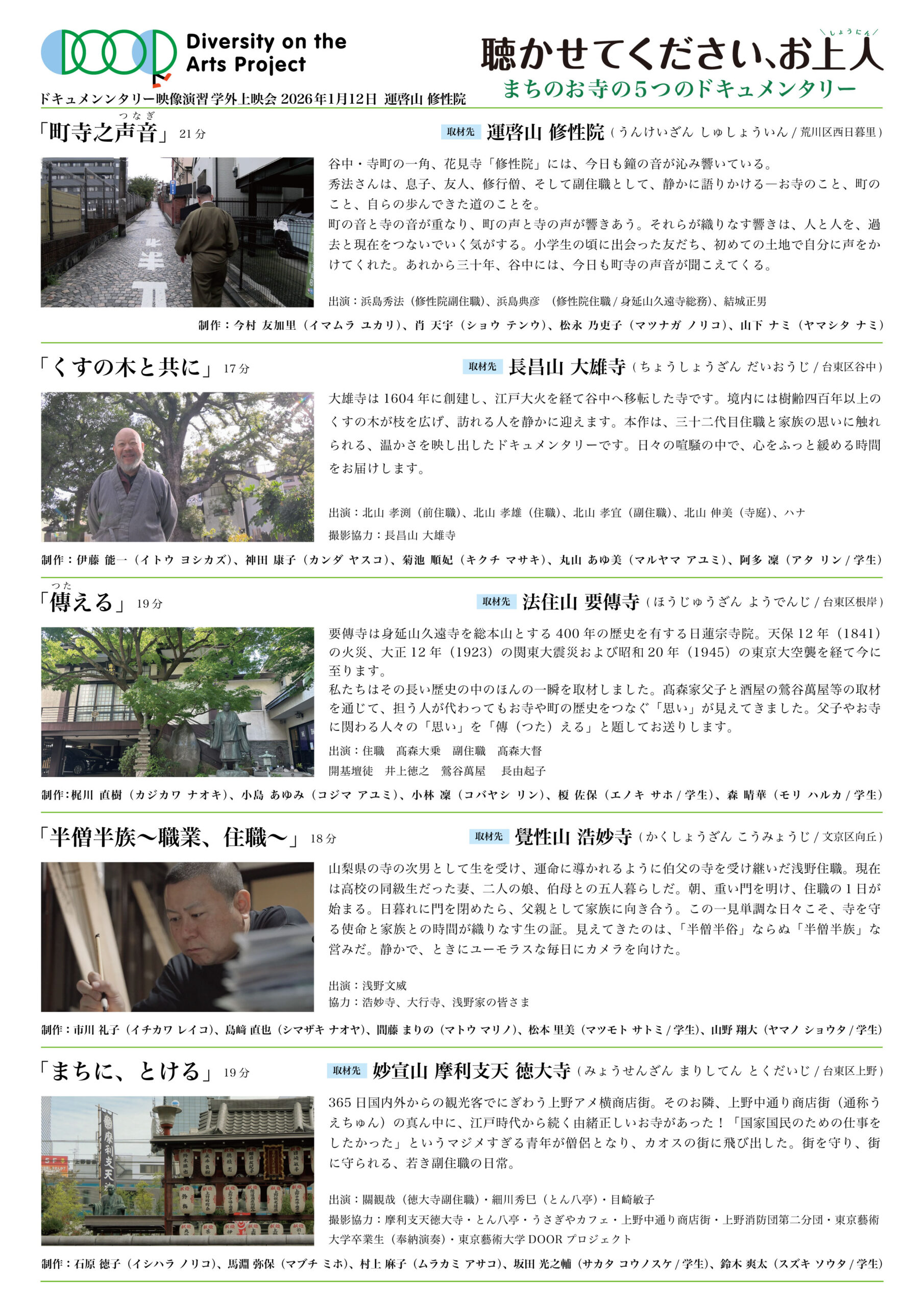 2026年1月12日 ドキュメンタリー映像演習 学外上映会「聴かせてください、お上人(しょうにん)まちのお寺の5つのドキュメンタリー」が、西日暮里の修性院の本堂をお借りして開催されました。午前の部と午後の部に分かれて、5つの作品の上映です。