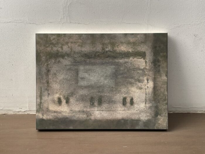 日本画専攻では主に和紙や岩絵具、膠などといった、昔から絵画制作に使われてきた画材を用いて絵を描いています。私も空気感や感情などの曖昧なものを主題とするのに、適していると感じこのような日本画材を使っています。金属鉱物から作られる絵具は、加熱すると酸化し深い色合いへと変色します。また和紙と膠を選んだり加工したりすることで滲みの度合いが変わり、描いた物の輪郭の出方が変わったりします。こういった自然物だから出せる有機的な色合いや形を好ましく思い、日本画材による制作をしています。