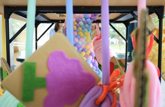 プログラム実践演習で制作した作品を郊外で展示した時の様子 /作品名『編んで繋がる』2024