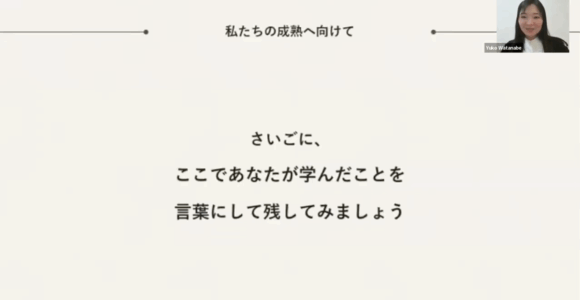 最後に、「私たちの成熟に向けて」として、これまでの内容をまとめながら「対話」が繰り返し得ない「生きたもの」であるとして、講義を結びました。